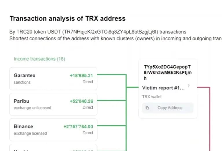 View the direct and indirect connection between the given address and the identified clusters, the total value sent to/from the target wallet, and the distance to it.